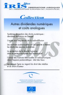 L'actualité transfrontalière du droit européen des médias :1. Systèmes de gestion des droits numériques : dernières évolutions en Europe2. L'accès aux fréquences de la radiodiffusion3. Les archives audiovisuelles et l'incapacité à libérer les droits des oeuvres orphelines4. La protection de la dignité humaine dans le secteur européen de l'audiovisuel5. L'octroi des licences télévisuelles et radiophoniques dans l'espace postsoviétique : état des lieux6. Les jeux en ligne au regard du droit des médias et du droit d'auteur