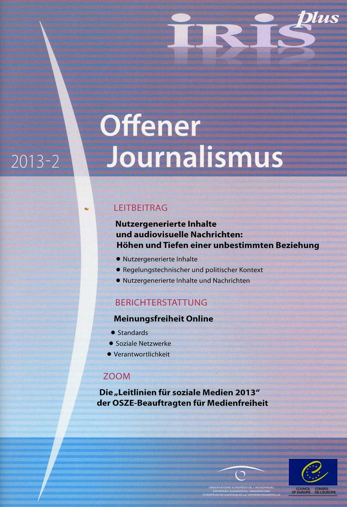 Der Leitbeitrag geht auf Aspekte des offenen Journalismus näher ein und beschreibt die Art von Informationen, die aus Quellen stammen, die keine Medien sind, sowie deren Auswirkungen auf Medieninhalte und auf den Prozess der Nachrichtenberichterstattung. Im Besonderen wird dabei auf den Begriff nutzergenerierte Inhalte (user generated content - UGC) und dessen unterschiedliche Bedeutungen eingegangen; es werden verschiedene Arten von UGC unterschieden und die rechtlichen Konsequenzen dieser Unterschiede erläutert. Darüber hinaus beschäftigt sich der Artikel mit dem größeren politischen und regelungstechnischen Kontext, in dem nutzergenerierte Inhalte zu bewerten sind, und geht auch auf die sich entwickelnde Beziehung zum audiovisuellen Sektor ein.