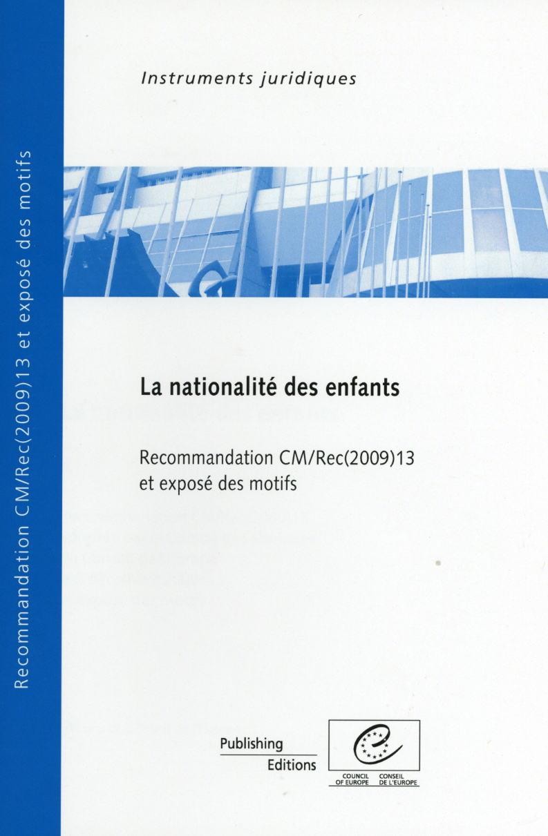 La Recommandation CM/Rec(2009)13 sur la nationalité des enfants vise principalement à réduire les cas d'apatridie d'enfants, à faciliter leur accès à une nationalité et à garantir leur droit à une nationalité.La recommandation comporte différents chapitres consacres à la réduction de l'apatridie, à la nationalité résultant de la filiation, aux enfants nés d'un parent étranger sur le territoire d'un Etat, à la situation des enfants considérés comme des ressortissants, aux droits des enfants dans les procédures affectant leur nationalité, ainsi qu'à l'enregistrement des naissances.