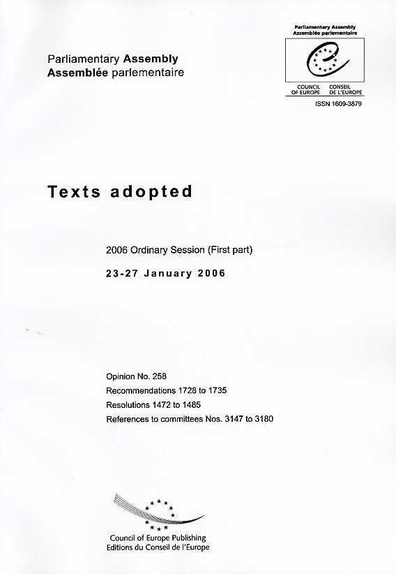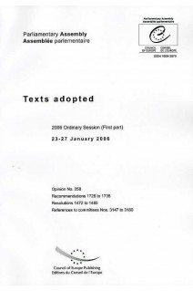 This part-volume brings together all the texts adopted by the Parliamentary Assembly during the first part of the 2006 Ordinary Session (23-27 January 2006). The Assembly meets four times every year (January, April, June and October).The Assembly can adopt three different types of texts: opinions, recommendations and resolutions.Opinions are mostly expressed by the Assembly on questions put to it by the Committee of Ministers, such as the admission of new member states to the Council of Europe, but also on draft conventions, or the budget.Recommendations contain proposals addressed to the Committee of Ministers, the implementation of which is within the competence of governments.Resolutions embody decisions by the Assembly on questions which it is empowered to put into effect or expressions of views for which it alone is responsible. They can also be addressed to national parliaments.References to committees: the Bureau of the Assembly decides whether communications - in particular from the Committee of Ministers and from the Secretary General - and motions for recommendations and resolutions should be referred to the appropriate committee for action, if any. Referrals are then ratified by the Parliamentary Assembly.The Parliamentary Assembly's publications include, among others, the Officiai report of debates, Assembly documents and Orders of the day and minutes of proceedings.
