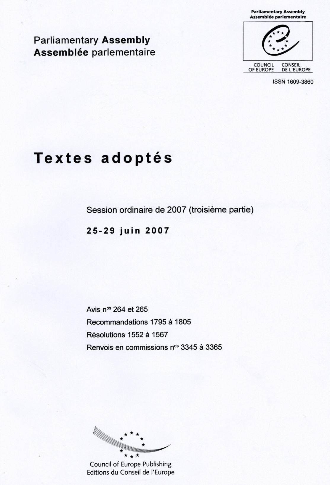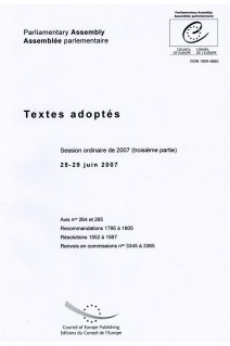 Ce volume regroupe les textes adoptés par Assemblée parlementaire du Conseil de I'Europe lors de latroisième partie de la session ordinaire de 2007 (25-29 juin 2007). L'Assemblée se réunit quatre fois par an (janvier, avril, juin et octobre).L'Assemblée adopte trois types de textes: des avis, des recommandations et des résolutions.Les avis se réfèrent généralement à des questions qui lui ont été soumises par le Comite des Ministres, organe exécutif de l'Organisation. Ce dernier consulte l'Assemblée avant de prendre certaines décisions importantes telles que I'adhésion de nouveaux Etats membres au Conseil de I'Europe, I'adoption des projets de conventions ou de budget.Les recommandations comportent des propositions adressées au Comite des Ministres, dont l'application est du ressort des gouvernements.Les résolutions reflètent les décisions que Assemblée est habilitée à régler, ou I'expression d'opinions qui engagent sa seule responsabilité ou s'adressent aux parlements nationaux.Les renvois en commissions: les propositions de recommandation ou de résolution ainsi que les communications - en particulier du Comite des Ministres et du Secrétaire Général - font I'objet d'une proposition du Bureau de l'Assemblée pour la saisine de la commission compétente, qui doit être ratifiée par l'Assemblée parlementaire.Les publications de I'Assemblée parlementaire comprennent, en outre, les Comptes rendus, les Documents de séance, les séance du jour et procès-verbaux.