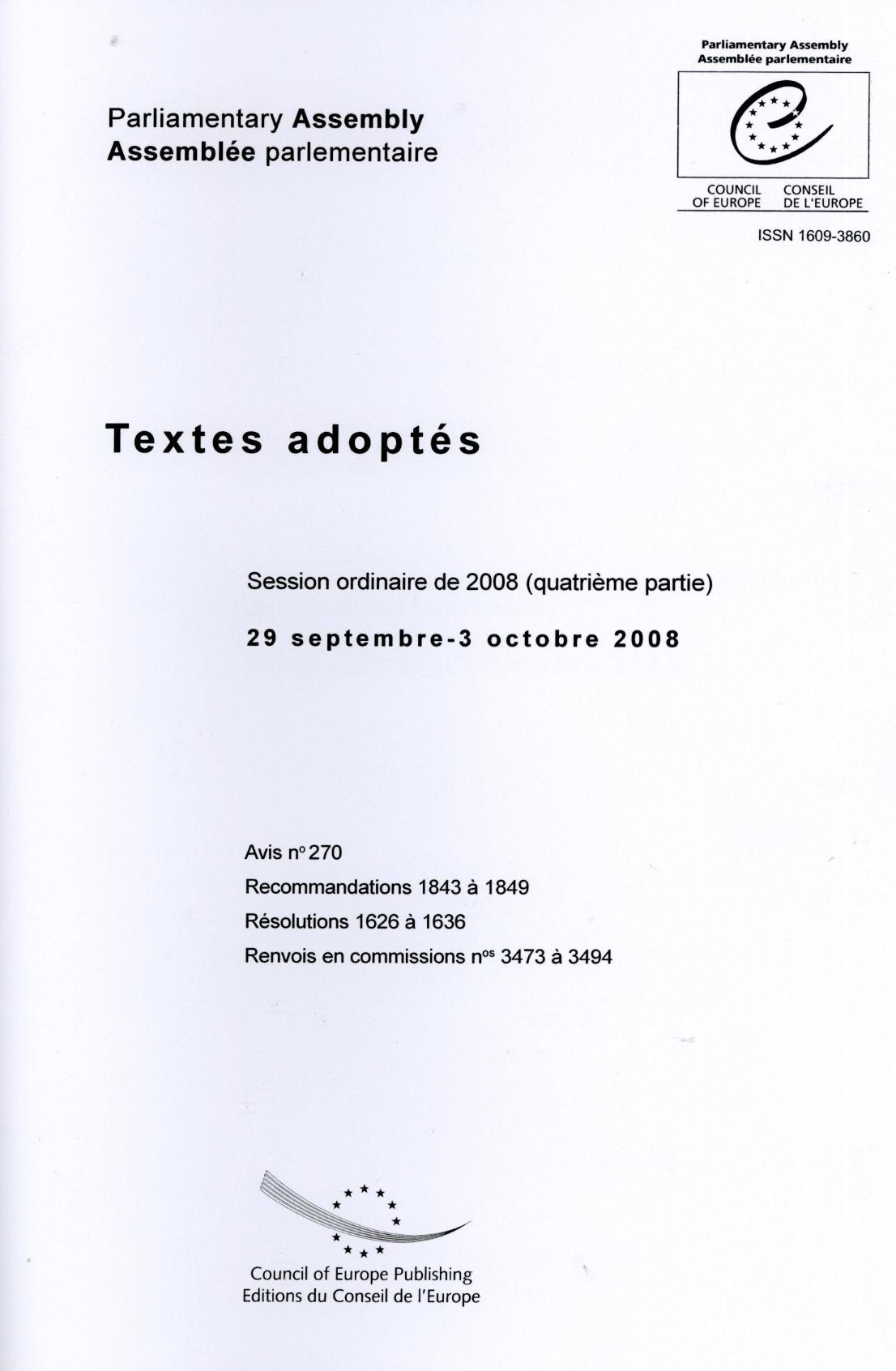 Ce volume regroupe les textes adoptés par Assemblée parlementaire du Conseil de l'Europe lors de la quatrième partie de la session ordinaire de 2008 (29 septembre - 3 octobre 2008). L'Assemblée se réunit quatre fois par an (janvier, avril, juin et octobre).L'Assemblée adopte trois types de textes: des avis, des recommandations et des résolutions.Les avis se réfèrent généralement à des questions qui lui ont été soumises par le Comite des Ministres, organe exécutif de l'Organisation. Ce dernier consulte l'Assemblée avant de prendre certaines décisions importantes telles que l'adhésion de nouveaux Etats membres au Conseil de l'Europe, l'adoption des projets de conventions ou de budget.Les recommandations comportent des propositions adressées au Comite des Ministres, dont l'application est du ressort des gouvernements.Les résolutions reflètent les décisions que Assemblée est habilitée à régler, ou l'expression d'opinions qui engagent sa seule responsabilité ou s'adressent aux parlements nationaux.Les renvois en commissions: les propositions de recommandation ou de résolution ainsi que les communications - en particulier du Comite des Ministres et du Secrétaire Général - font l'objet d'une proposition du Bureau de l'Assemblée pour la saisine de la commission compétente, qui doit être ratifiée par l'Assemblée parlementaire.
