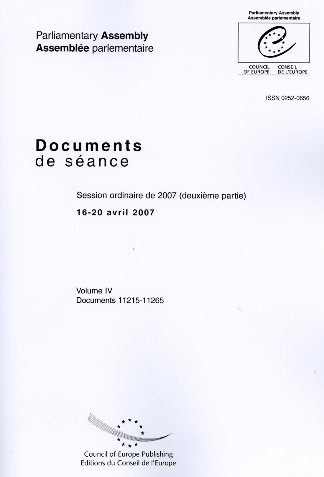 Les volumes III et IV regroupent l'ensemble des documents déposés devant l'Assemblée parlementaire du Conseil de l'Europe lors de la deuxième partie de la session ordinaire de 2007 (16-20 avril 2007). L'Assemblée se réunit quatre fois par an (janvier, avril, juin et octobre).Les publications de l'Assemblée parlementaire comprennent, en outre, les Textes adoptes, les Comptes rendus, les Ordres du jour et procès-verbaux.