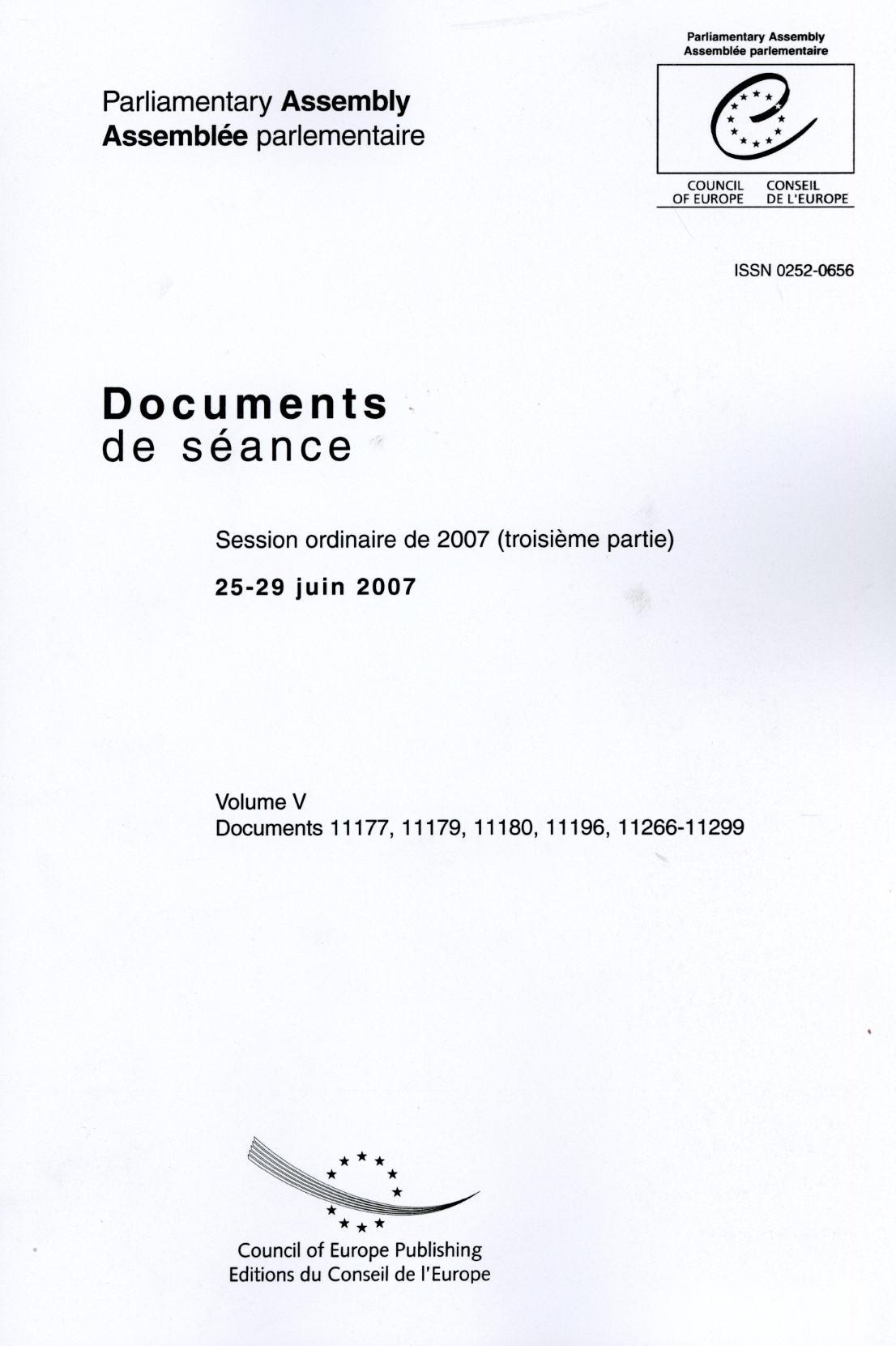 Les volumes V et VI regroupent l'ensemble des documents déposés devant l'Assemblée parlementaire du Conseil de l'Europe lors de la troisième partie de la session ordinaire de 2007 (25-29 juin 2007). L'Assemblée se réunit quatre fois par an (janvier, avril, juin et octobre).Les publications de l'Assemblée parlementaire comprennent, en outre, les Textes adoptes, les Comptes rendus, les Ordres du jour et procès-verbaux.