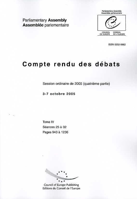 Ce volume regroupe les sténogrammes des débats de l'Assemblée parlementaire du Conseil de l'Europe lors de la quatrième partie de la session ordinaire de 2005 (3-7 octobre 2005). L'Assemblée se réunit quatre fois par an (janvier, avril, juin et octobre).Les publications de l'Assemblée parlementaire comprennent, en outre, les Textes adoptés, les Documents de séance, et les Ordres du jour et procès-verbaux.