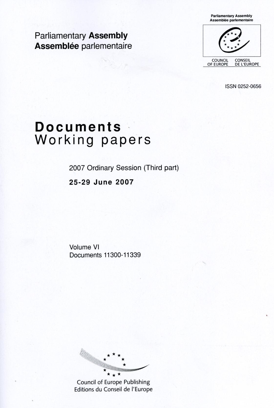 Volume V and VI bring together all the documents presented to the Parliamentary Assembly of the Council of Europe at the third part of the 2007 Ordinary Session (25-29 June 2007). The Assembly meets four times every year (January, April, June and October).The Parliamentary Assembly's publications include, among others, Adopted texts, the Official report of debates and Orders of the day and minutes of proceedings.