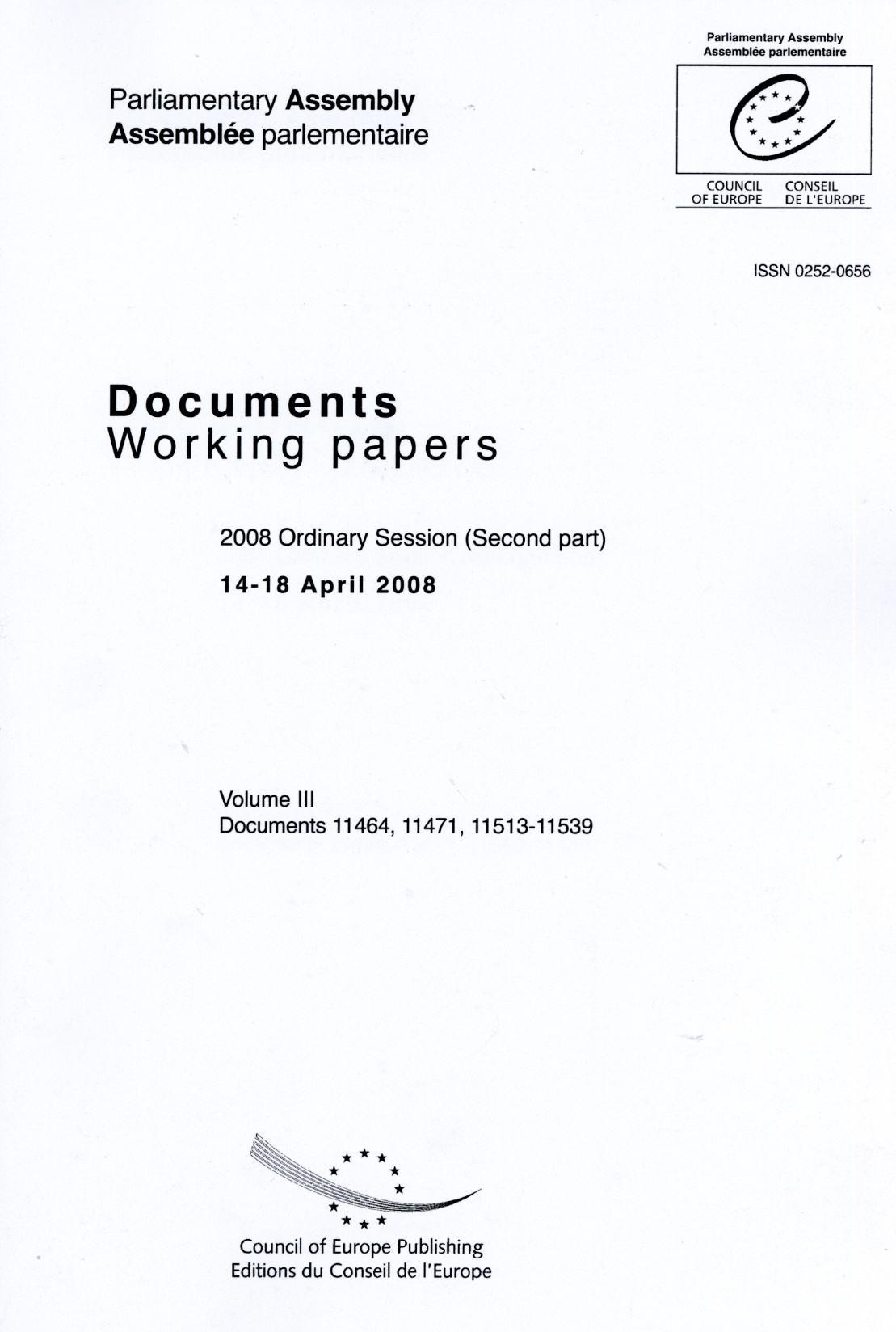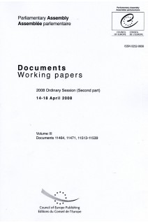 Volumes III and IV bring together all the documents presented to the Parliamentary Assembly of the Council of Europe at the second part of the 2008 Ordinary Session (14-18 April 2008). The Assembly meets four times every year (January, April, June and October).The Parliamentary Assembly's publications also include the adopted texts. The official reports and debates, the orders of the day (audio format) and the minutes of proceedings are available on DVD.