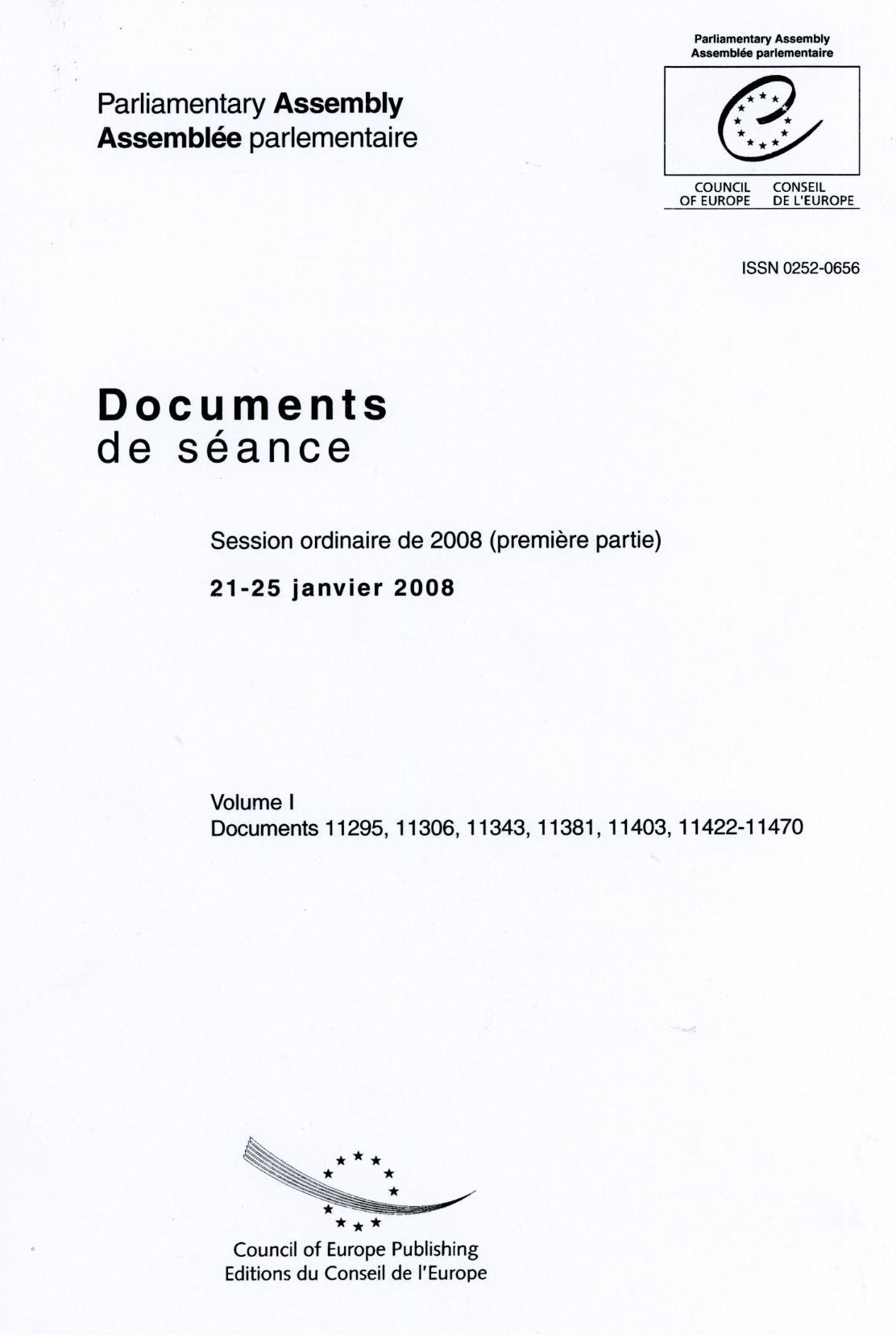 Les volumes I et II regroupent l'ensemble des documents déposés devant l'Assemblée parlementaire du Conseil de l'Europe lors de la première partie de la session ordinaire de 2008 (21-25 janvier 2008). L'Assemblée se réunit quatre fois par an (janvier, avril, juin et octobre).Les publications de l'Assemblée parlementaire comprennent, en outre, les Textes adoptes, les Comptes rendus, les Ordres du jour et procès-verbaux.