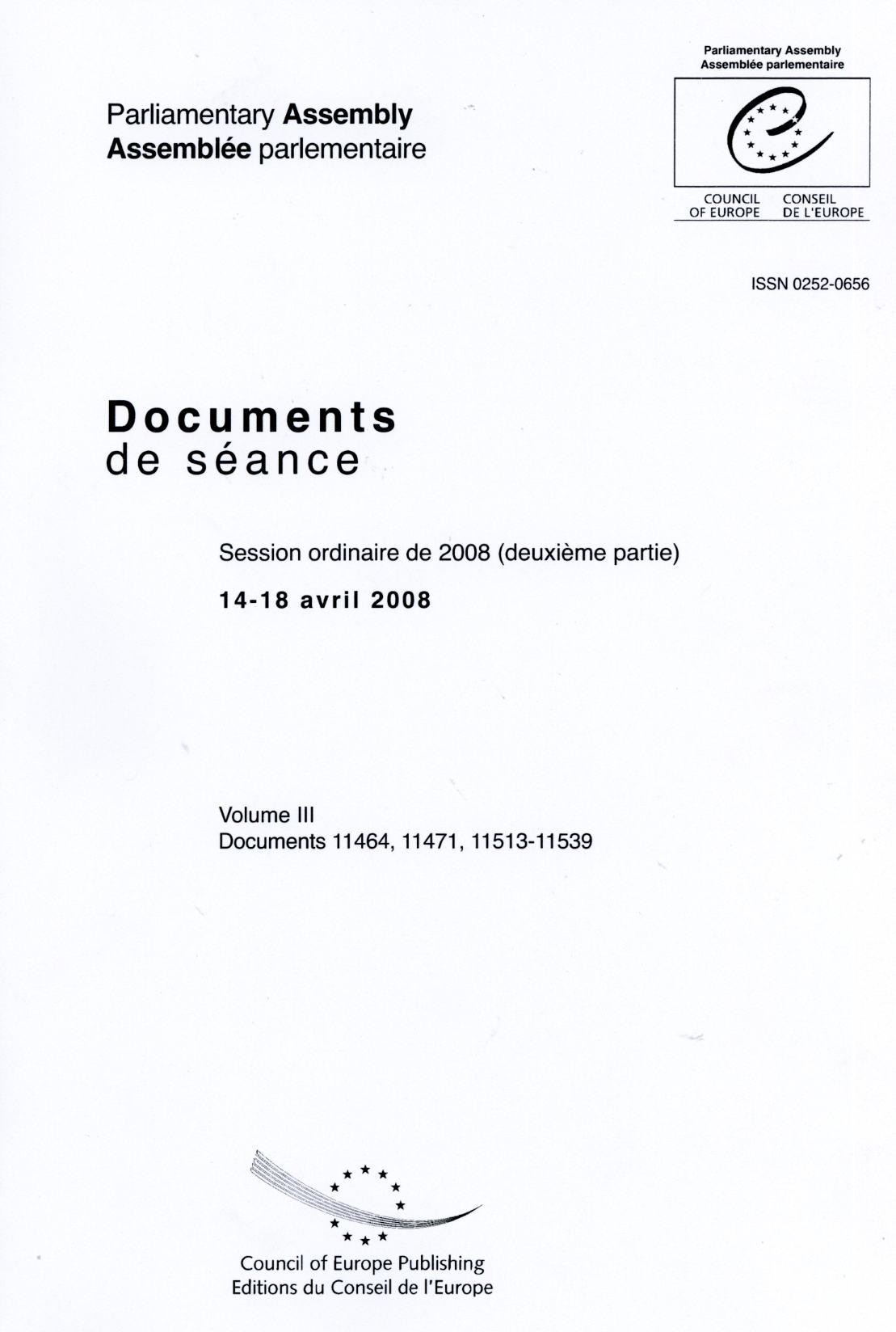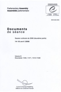Les volumes III et IV regroupent l'ensemble des documents déposés devant l'Assemblée parlementaire du Conseil de l'Europe lors de la deuxième partie de la session ordinaire de 2008 (14-18 avril 2008). L'Assemblée se réunit quatre fois par an (janvier, avril, juin et octobre).Les publications de l'Assemblée parlementaire comprennent, en outre, les Textes adoptes, les Comptes rendus (format audio), les Ordres du jour et procès-verbaux sont disponibles en DVD.