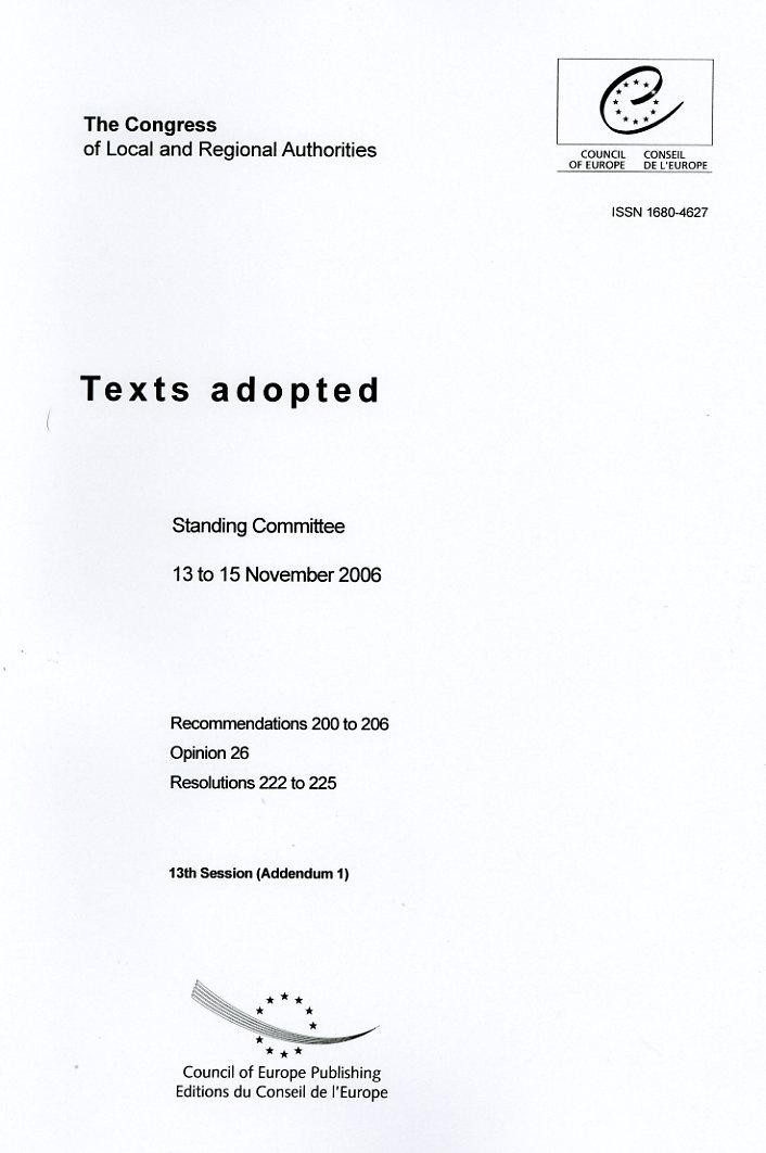 Congress of local and Regional Authorities - Texts adopted - Standing Committee 13 to 15 November 2006 - Recommendations 200 to 206, Opinion 26, Resolutions 222 to 225 - 13th Session (Addendum 1) (2007)