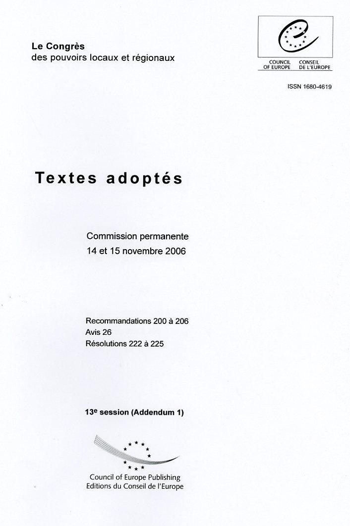 Congrès des pouvoir locaux and régionaux - Textes adoptés - Commission permanente 14 et 15 novembre 2006 - Recommandations 200 à 206, Avis 26, Résolutions 222 à 225 - 13e session (Addendum 1) (2007)