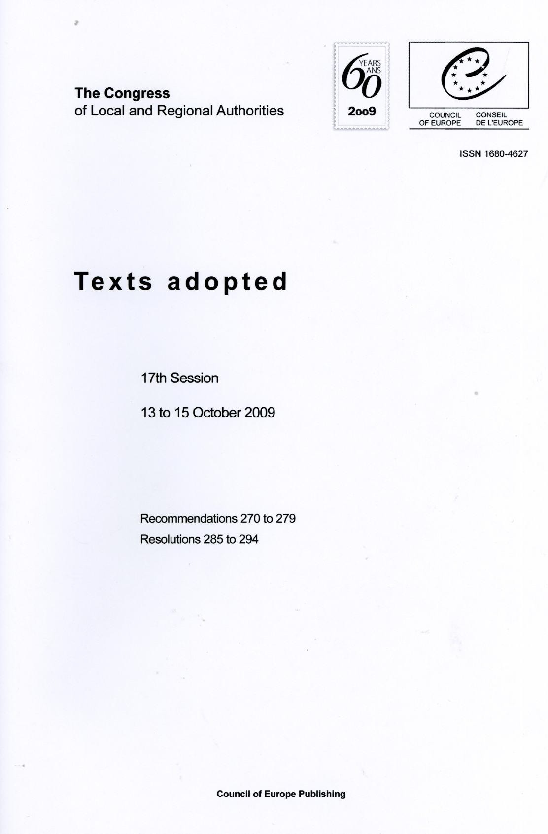 The Congress of Local and Regional Authorities - Texts adopted - 17th Session - 13 to 15 October 2009 (2010)