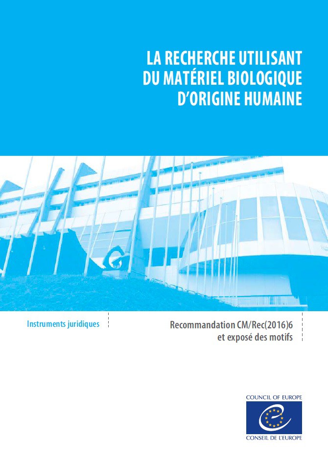 Cette recommandation, adoptée par le Comité des Ministres du Conseil de l’Europe le 11 mai 2016, a pour but d’énoncer et de protéger les droits fondamentaux des personnes dont le matériel biologique est destiné à la recherche biomédicale. Leur dignité, leur intégrité et leur vie privée doivent être garanties tout en assurant la continuité des bénéfices de ces recherches en donnant aux chercheurs un accès approprié aux matériels biologiques.