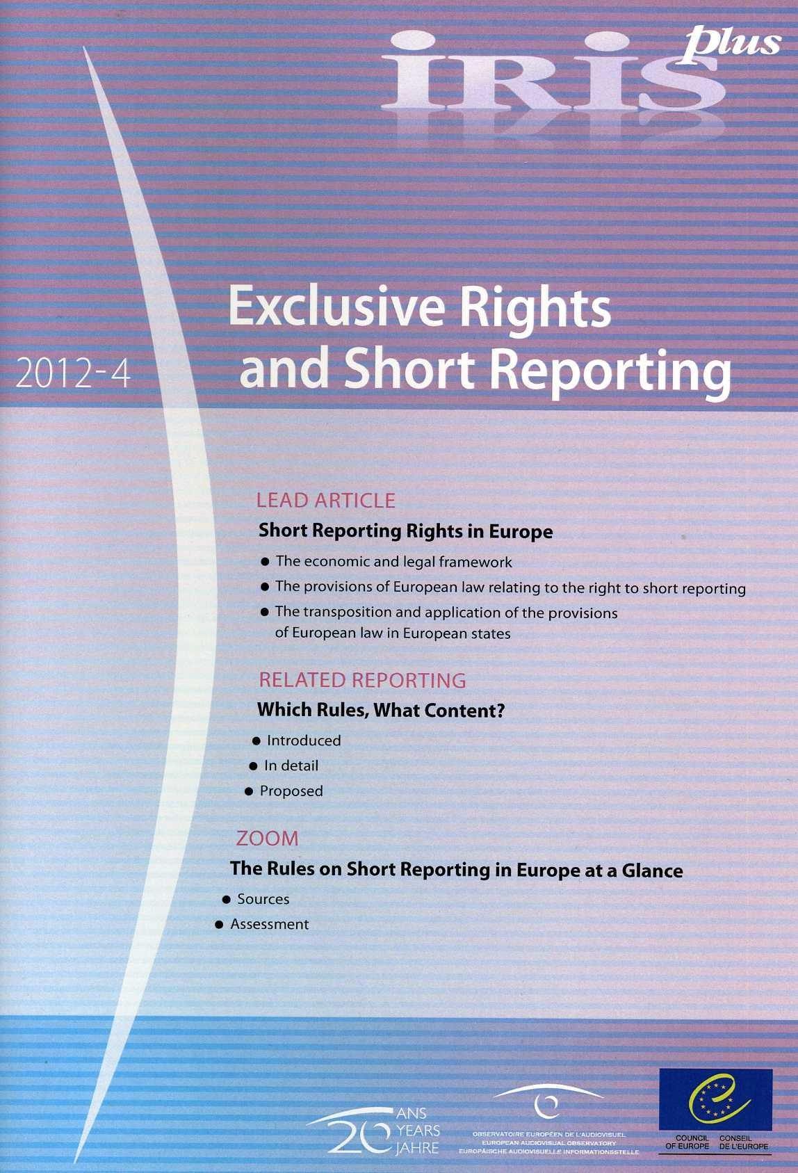 In dealing with the right to short reporting, this IRIS plus once again discusses a subject in respect of which the legislators have the task of achieving a balance between general socio-political interests and the economic interests of private companies. While there is a need to ensure that all audiovisual media are in principle able to report on every event of high public interest, account needs to be taken of the interest of rights holders in marketing such events as profitably as possible, which generally means that only those who pay money to the rights holders have access. The focus is on sports, and the sums paid for television transmission rights and other ways for the media to exploit events such as football matches, the Olympic Games or Formula 1 racing, have risen enormously in the last few decades, thus considerably increasing the refinancing pressures on those who pay them. Short reporting rights that limit expensively acquired exclusive rights and are granted to fellow competitors on the media market are a sensitive issue.