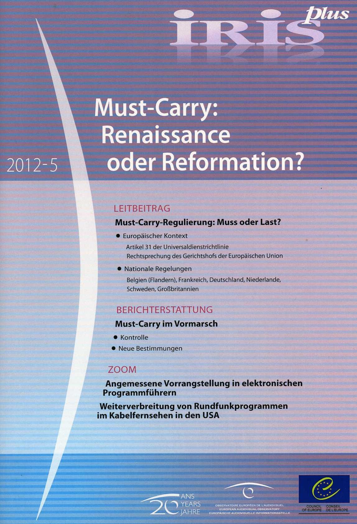 Die ersten Must-Carry-Regelungen gehen auf die Zeit zurück, als der Platz in analogen Rundfunknetzen knapp wurde und das Angebot durch die Einführung von Privatsendern schnell wuchs. Hauptgrund für die Einführung dieser Must-Carry-Regelungen war, den Zugang zu den öffentlichrechtlichen Rundfunksendern zu garantieren und eine vielfältige Programmauswahl zu sichern.Die Zeiten haben sich geändert und mit ihnen die Diskussion um Must-Carry-Regelungen. Diese Ausgabe der IRIS-plus gibt einen Einblick in die aktuelle Ausprägung der Must-Carry-Verpflichtungen in verschiedenen europäischen Ländern sowie den in den USA.