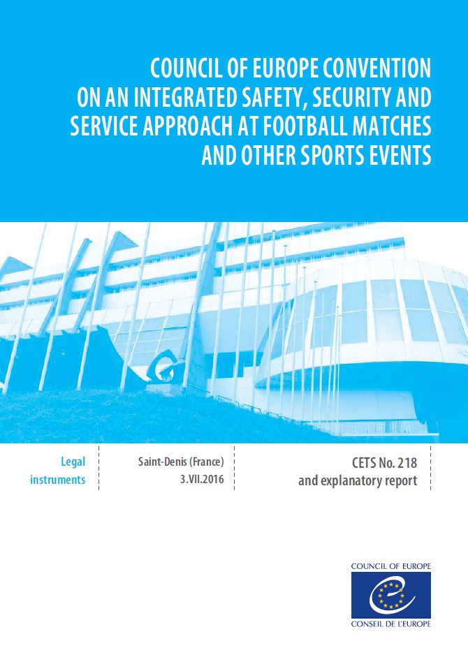 The Council of Europe Convention on an Integrated Safety, Security and Service Approach at Football Matches and Other Sports Events was opened for signature on 3 July 2016 in Saint-Denis (France), at a UEFA EURO 2016 quarter-final match. This Convention is the only internationally binding instrument to establish an integrated approach based on three interdependent pillars: safety, security and service. It also promotes co-operation between all public and private stakeholders, including supporters, in order to provide a safe, secure and welcoming environment at football matches and other sports events.